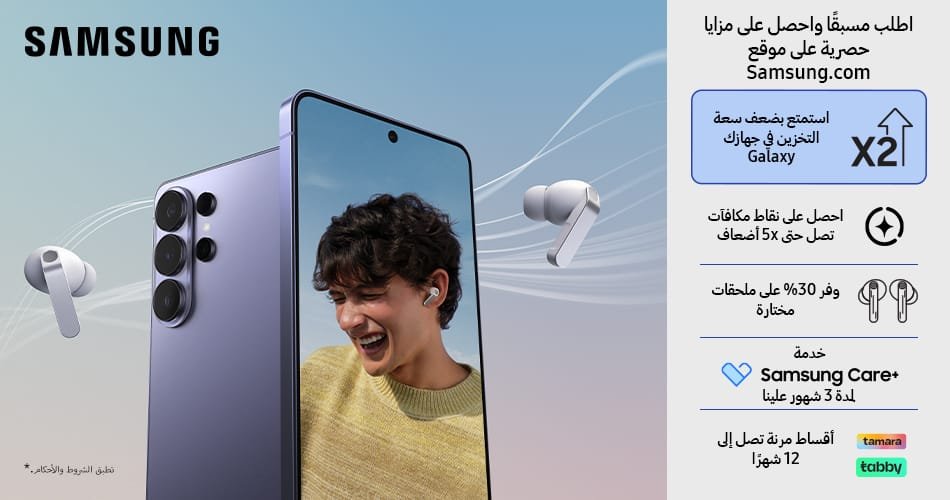 لا تفوت مزايا الطلب المسبق المذهلة هذه. ارتقِ بأجهزتك التقنية، واستكشف إمكانيات لا حصر لها، وأتمم طلبك المسبق اليوم عبر الرابط التالي https://www.samsung.com/sa/smartphones/galaxy-s26-ultra/buy/