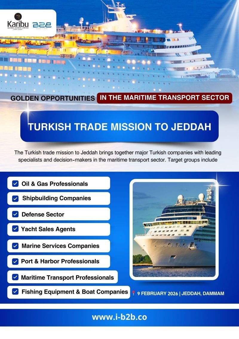 تستعد مدينة جدة لاستضافة فعالية “البعثة التجارية التركية إلى جدة” في 9 فبراير 2026، والتي تنظمها Karibu Global Events Limited بالتعاون مع منصة B2B، بمشاركة نخبة من الشركات التركية الرائدة في مجالات النقل البحري والصناعات المرتبطة به.
